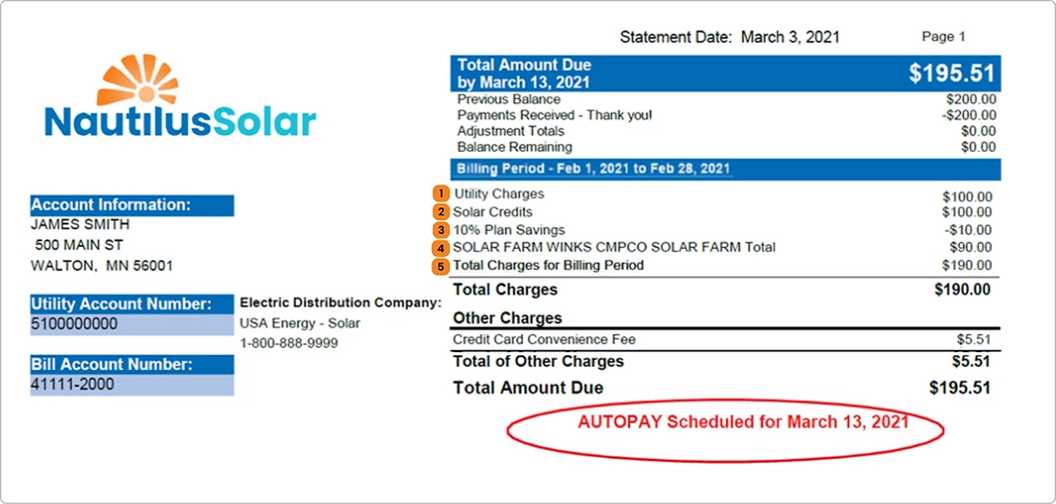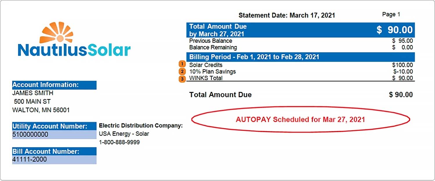With the Two-Bill format, you will continue to pay your utility company’s bill directly to them. Your solar credits will appear on that statement. You will then receive a bill from Nautilus Solar for those credits minus your discount.